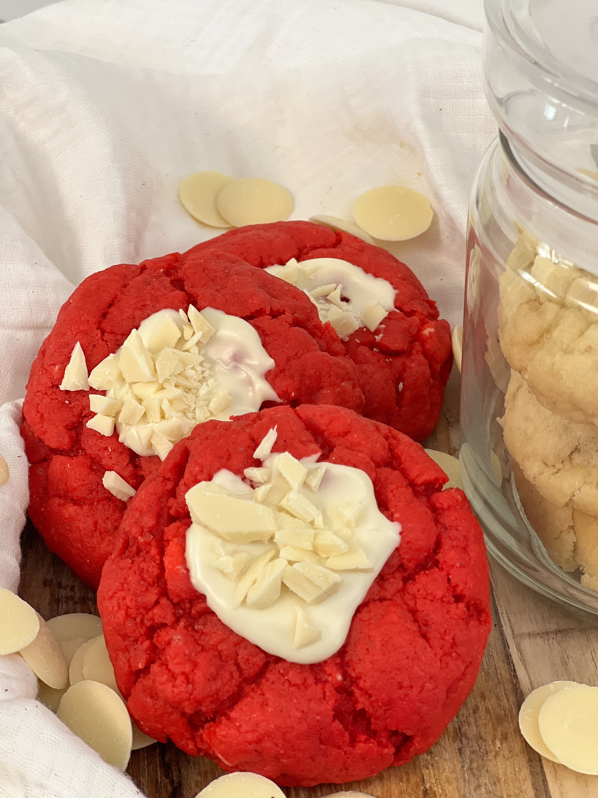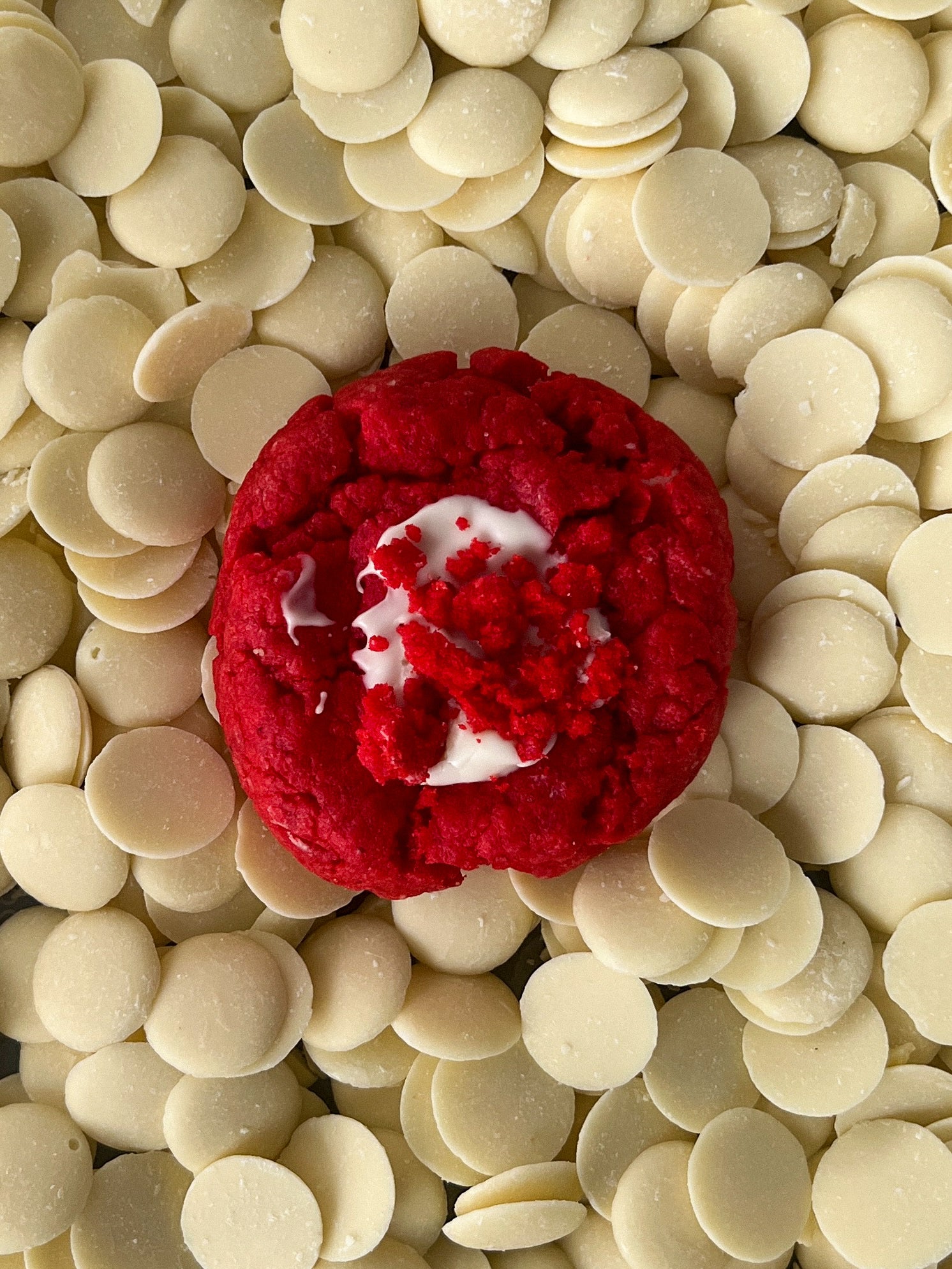 Sanfter Kakaoteig in leuchtendem rot, gefüllt mit weißer Schokoladencreme und zarten weißen Schokoladenstücken.