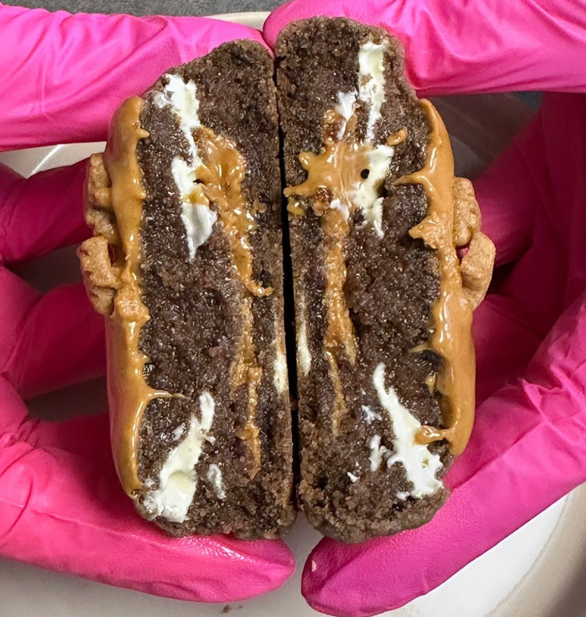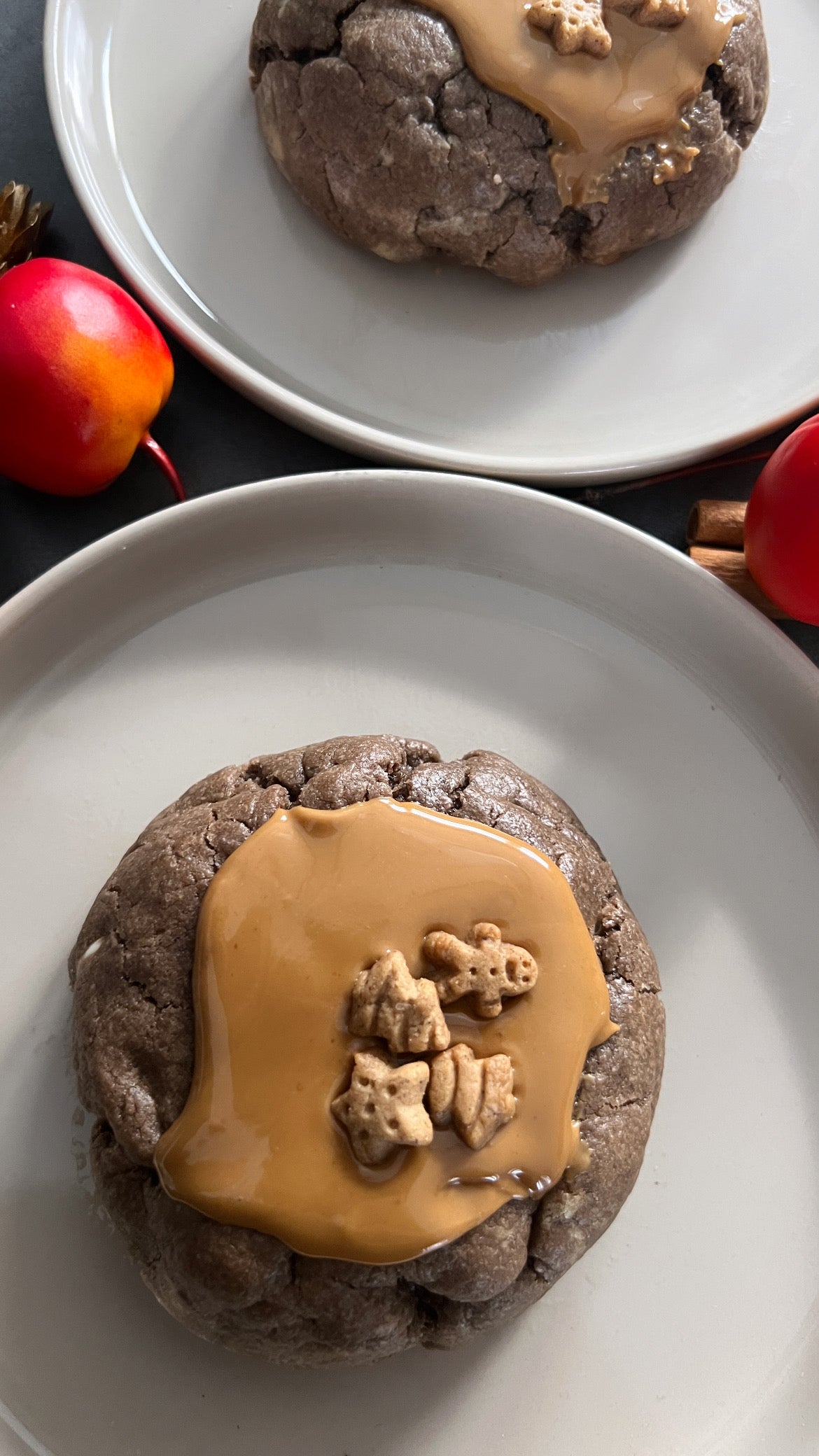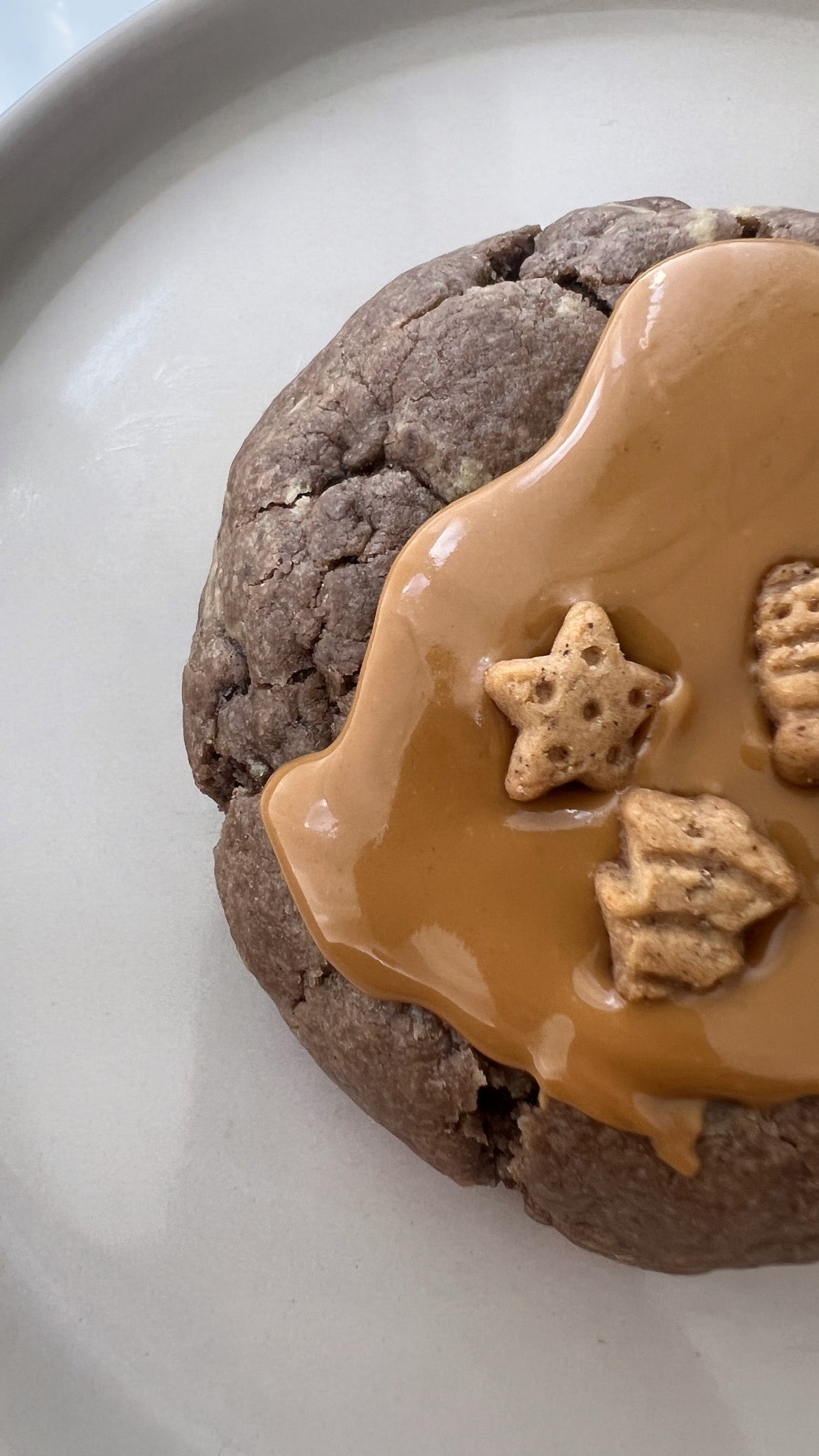 Zarter Schokoladenteig, verfeinert mit feinem Spekulatiusgewürz, trifft auf eine cremige Karamellfüllung, die sanft auf der Zunge schmilzt.
