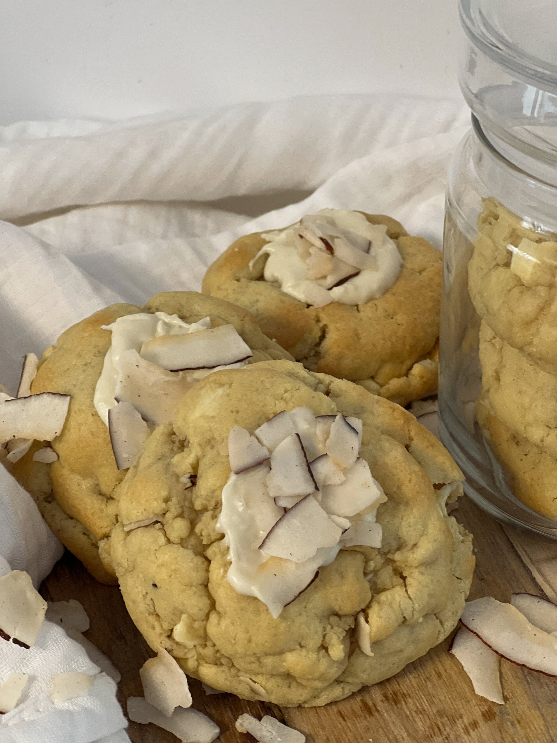 Knuspriger Cookie mit mit feiner Kokoscreme, gerösteten Kokosstückchen und weißer Schokolade-Urlaubsfeeling in jedem Bissen.